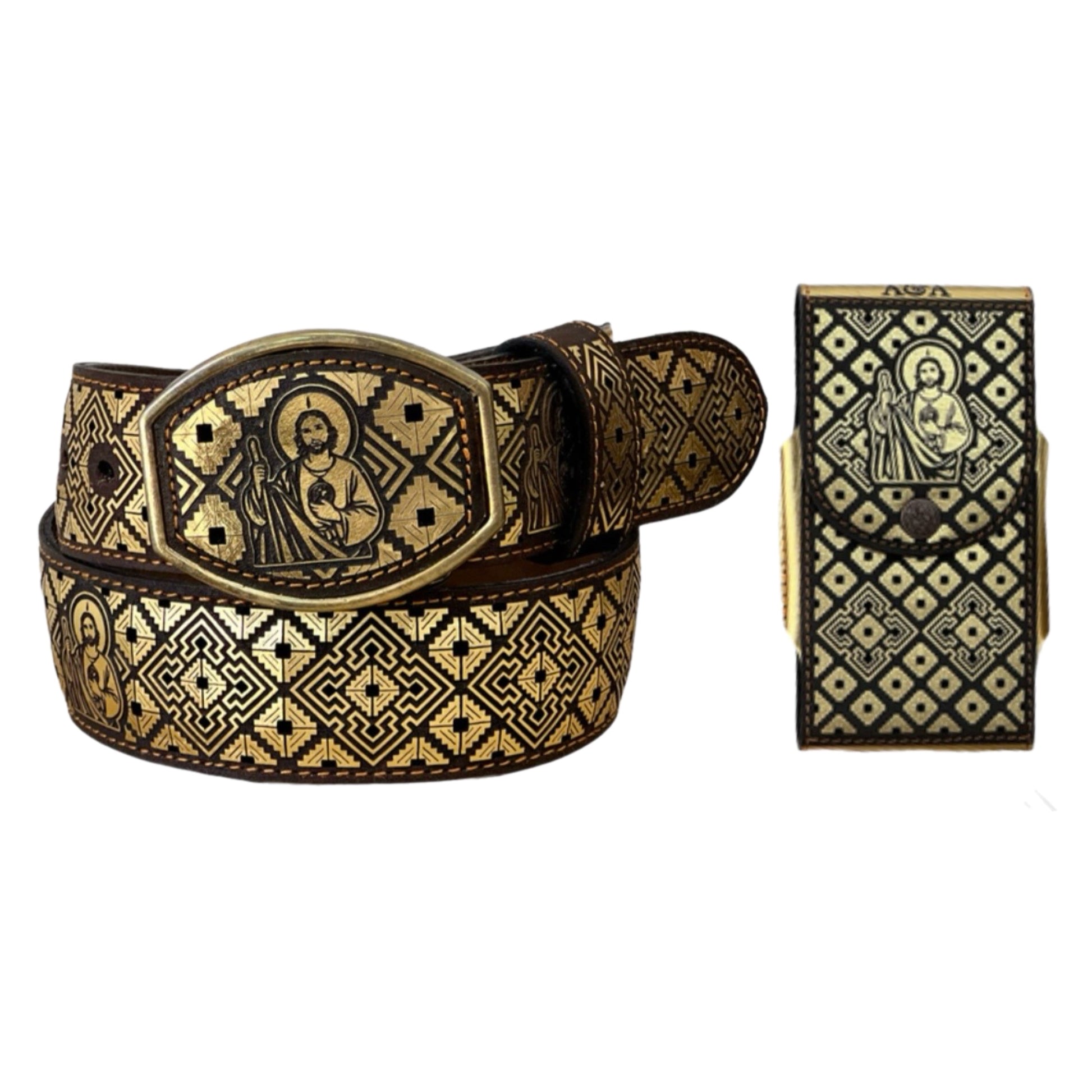 Honor faith, heritage, and bold style with the Gold San Judas Belt and Phone Holder Set. Crafted from premium genuine leather, this set features intricate gold-tone engraving inspired by San Judas Tadeo, creating a striking, western-inspired statement. The matching belt and phone holder deliver both practicality and standout design in one cohesive set.
