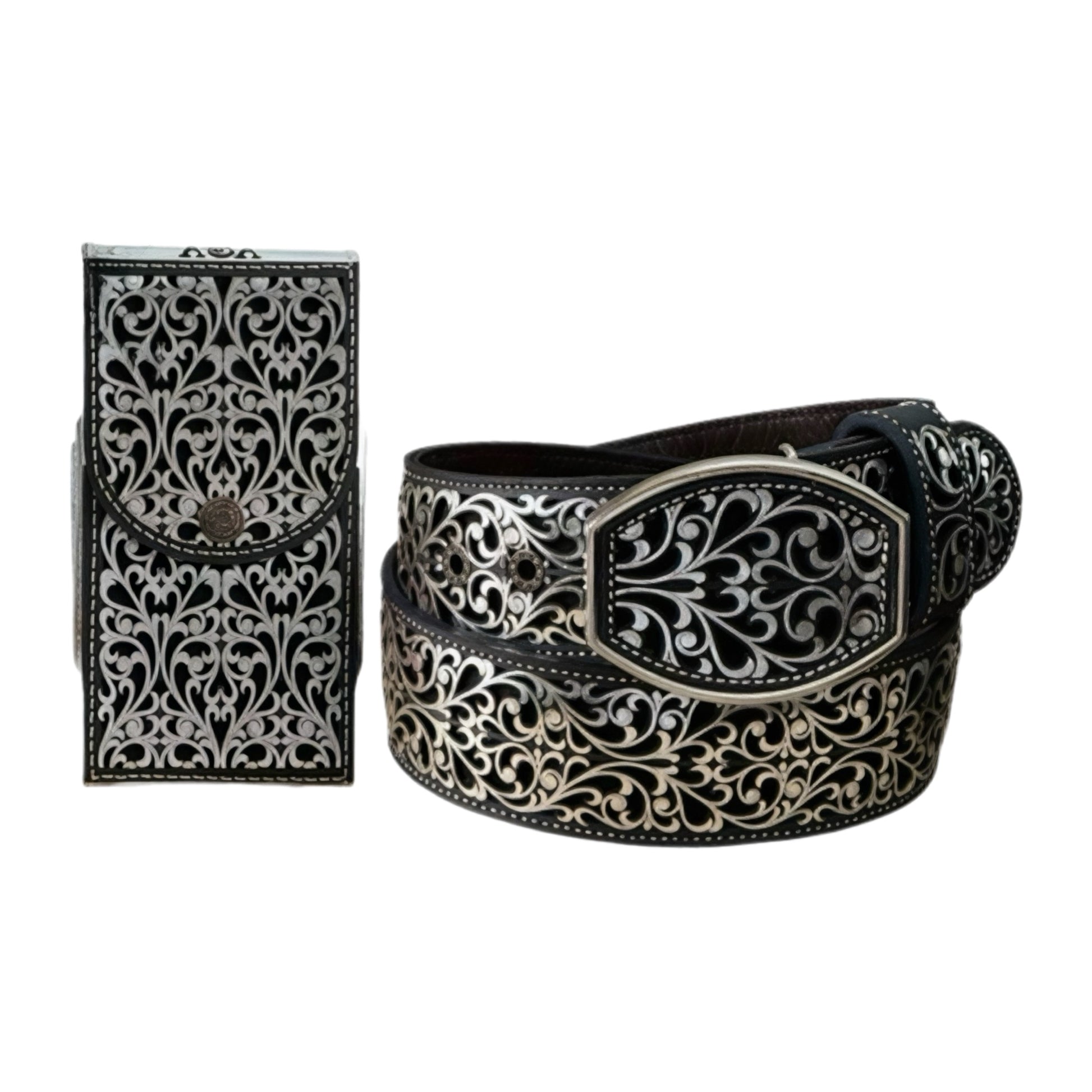 Silver Engraved Leather Belt and Phone Holder Set